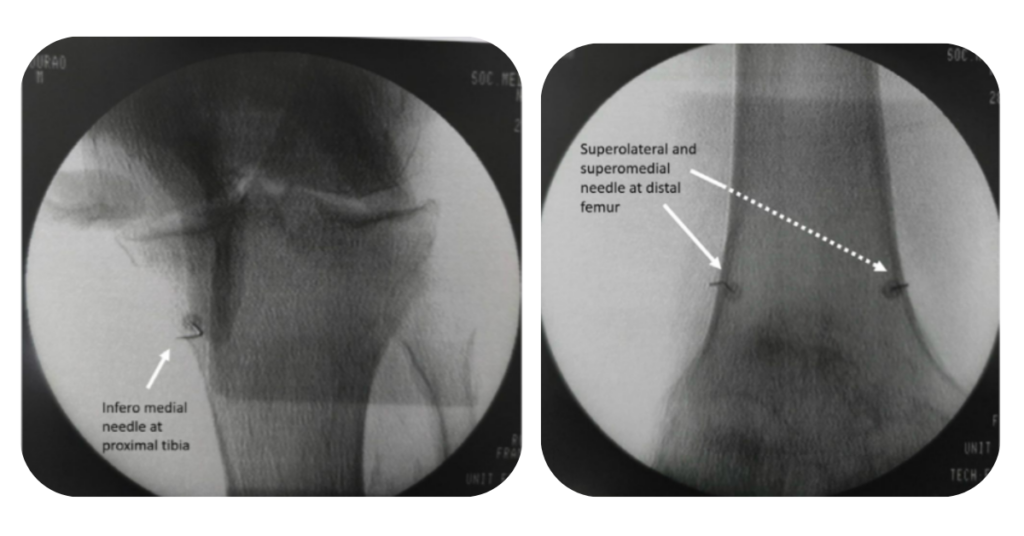 A rizotomia por radiofrequência é indicada para pacientes com dor crônica no joelho, especialmente com artrose avançada, que não querem ou não podem realizar cirurgia. O procedimento consiste em: